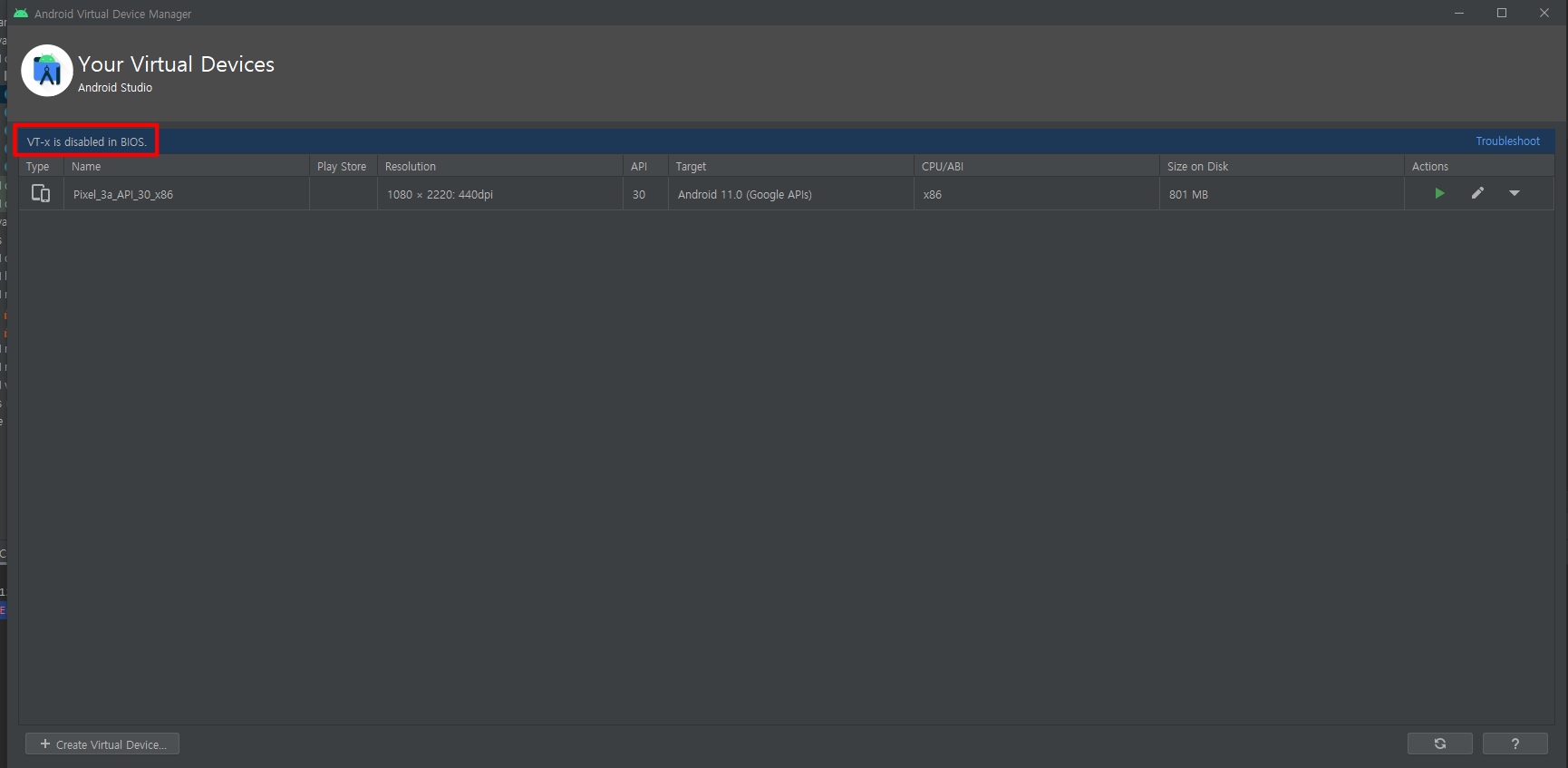 아니 AVD(=Android Virtual Device)가 왜 실행이 안되는거야?!!!