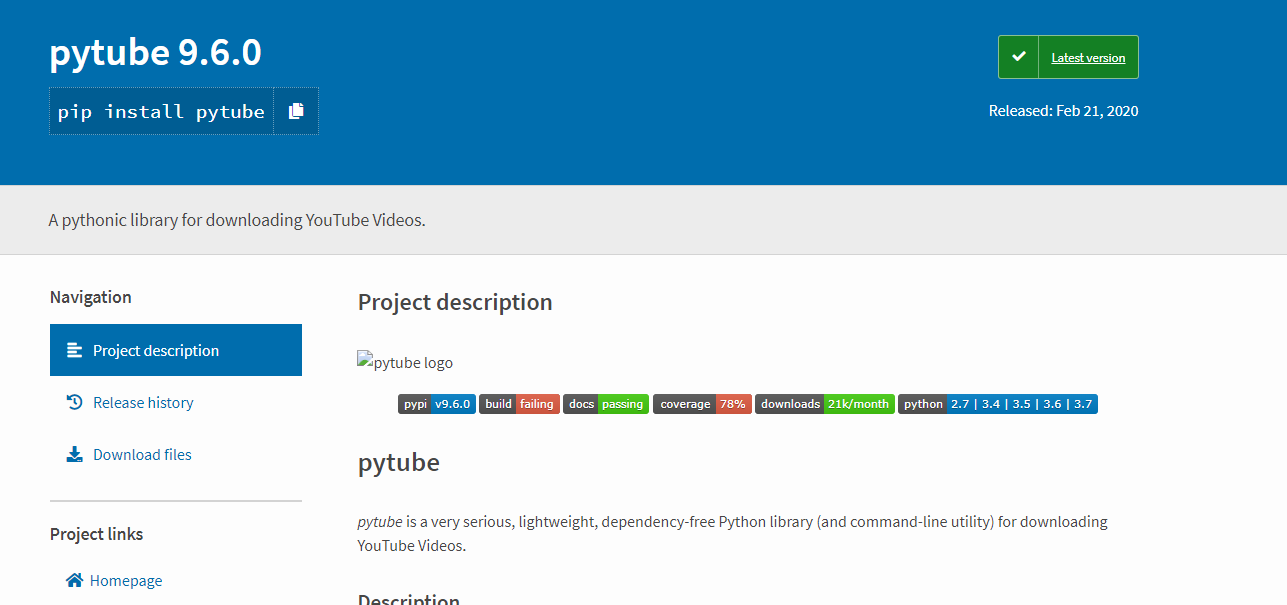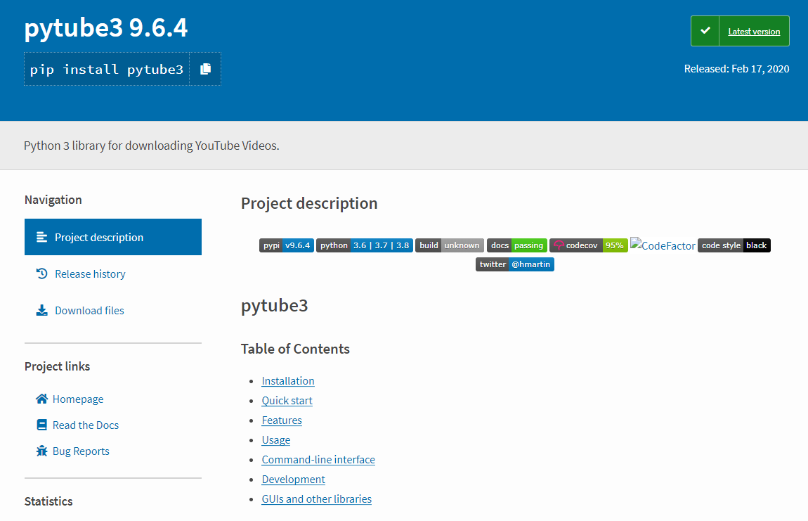 사용 가능한 python 버전을 보면 pytube3의 경우 3.6/3.7/3.8에서 가능하다고 한다.