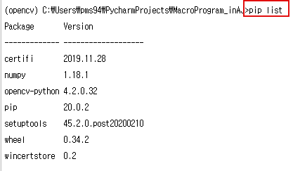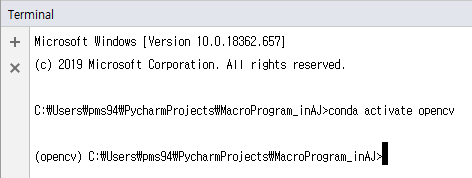 을 입력하면 해당 가상환경으로 접속이 되면서 명령어 입력창 앞쪽에 (opencv)라고 뜬 것을 확인할 수 있다.