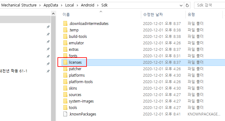 설치하고 나니 'Android SDK Location' 에 licenses 디렉토리가 생겨있더라.